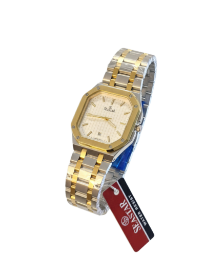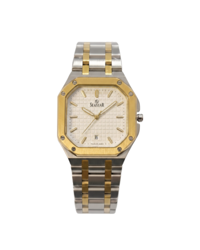 Discover the Seaster men’s watch, a striking fusion of classic and contemporary design. This timepiece showcases a captivating two-tone gold and silver aesthetic, perfectly complemented by a luxurious gold stainless steel dial. Encased in a distinctive square case and powered by a reliable quartz movement, it offers both precision and style. Featuring a convenient date display, the Seaster is the perfect statement piece for the modern gentleman.